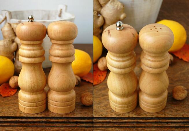 Zestaw pojemników na przyprawy: solniczka i młynek do pieprzu. Marka Vasa. Materiał: drewno, stal, plastik. Kolor drewna ...