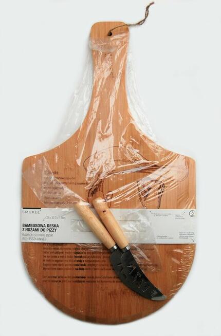 Bambusowa deska do serwowania pizzy z dwoma nożami, Smukee. Deska jest wykonana z wysokiej jakości drewna bambusowego. Jest ...