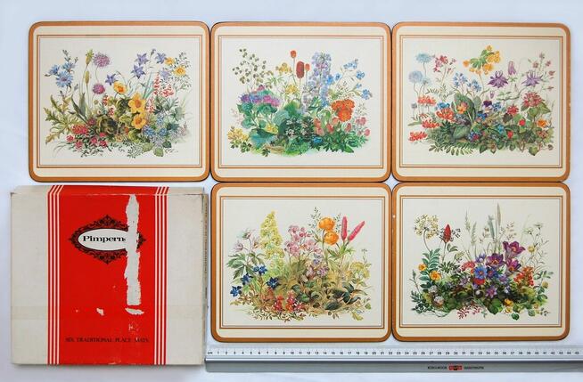 Komplet pięciu podkładek vintage na stół z motywem kwiatów łąkowych, Pimpernel, Portmerion, Wielka Brytania. ...