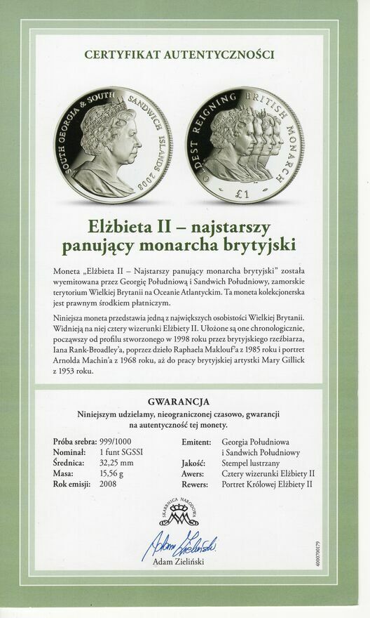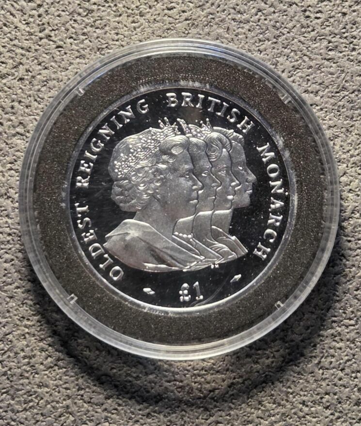 Numizmat srebrny najwyższej próby "ELŻBIETA II - NAJSTARSZY PANUJĄCY MONARCHA BRYTYJSKI"Na awersie uwidoczniono cztery wizerunki Elżbiety II, na rewersie widnieje Portret Królowej Elżbiety II.